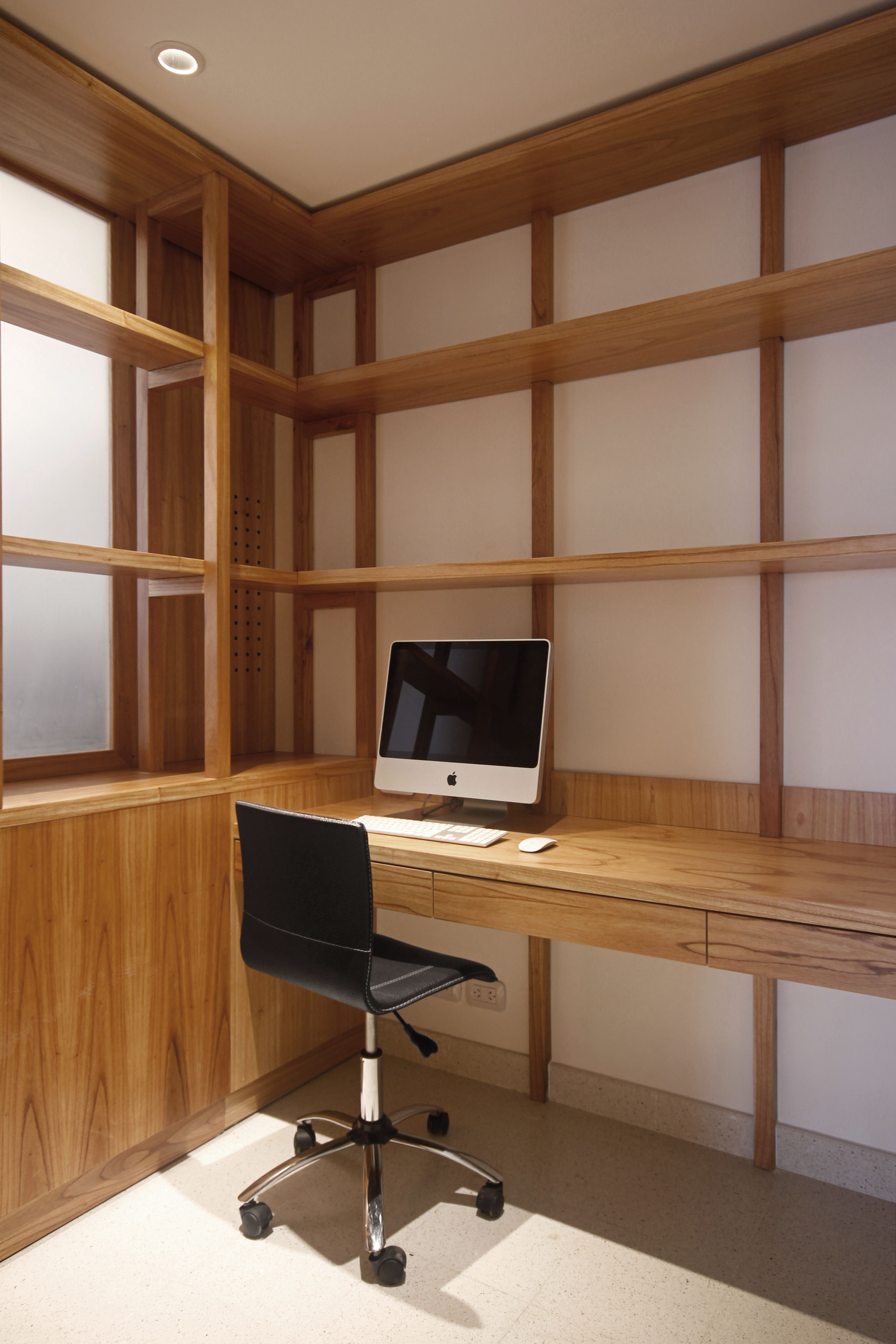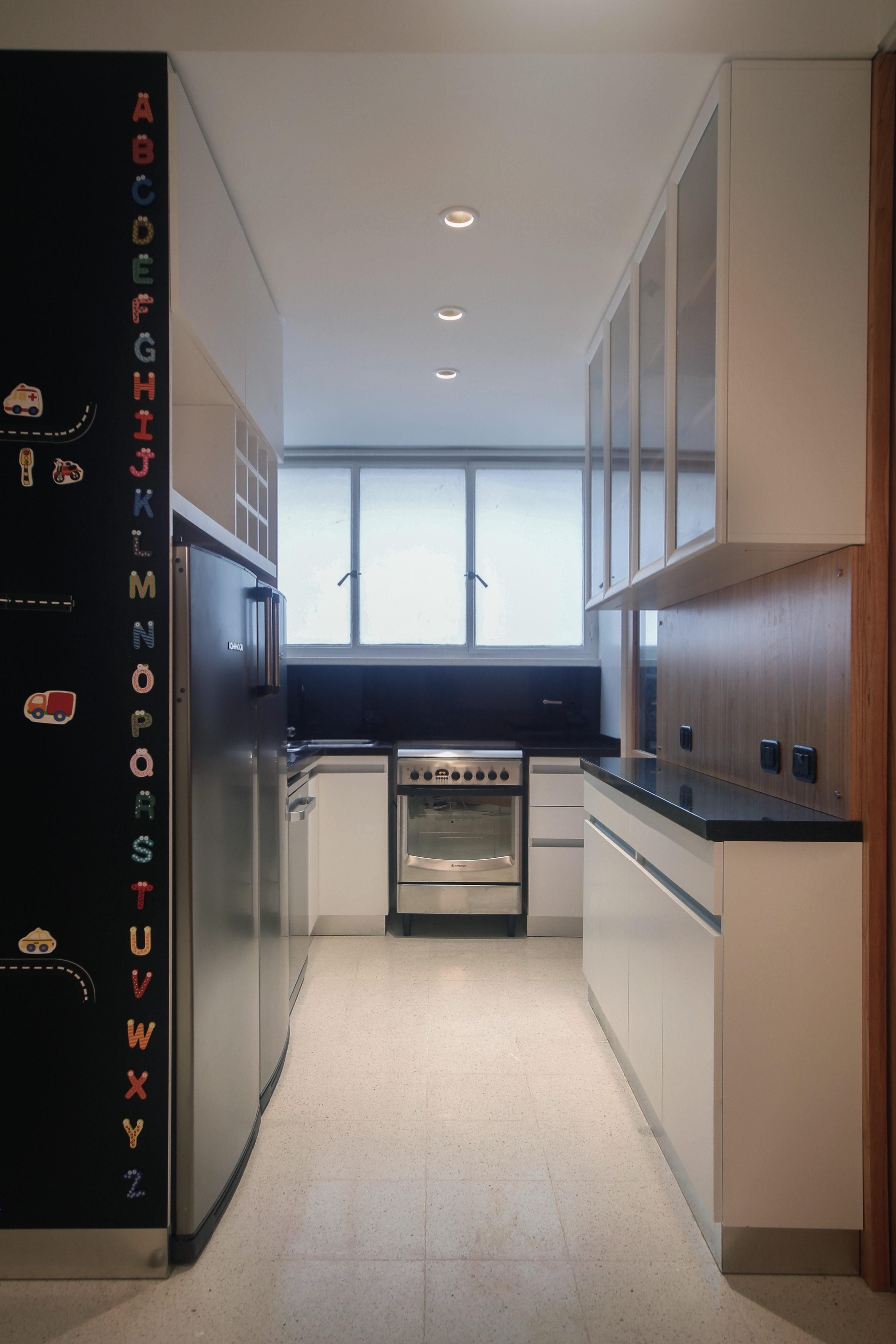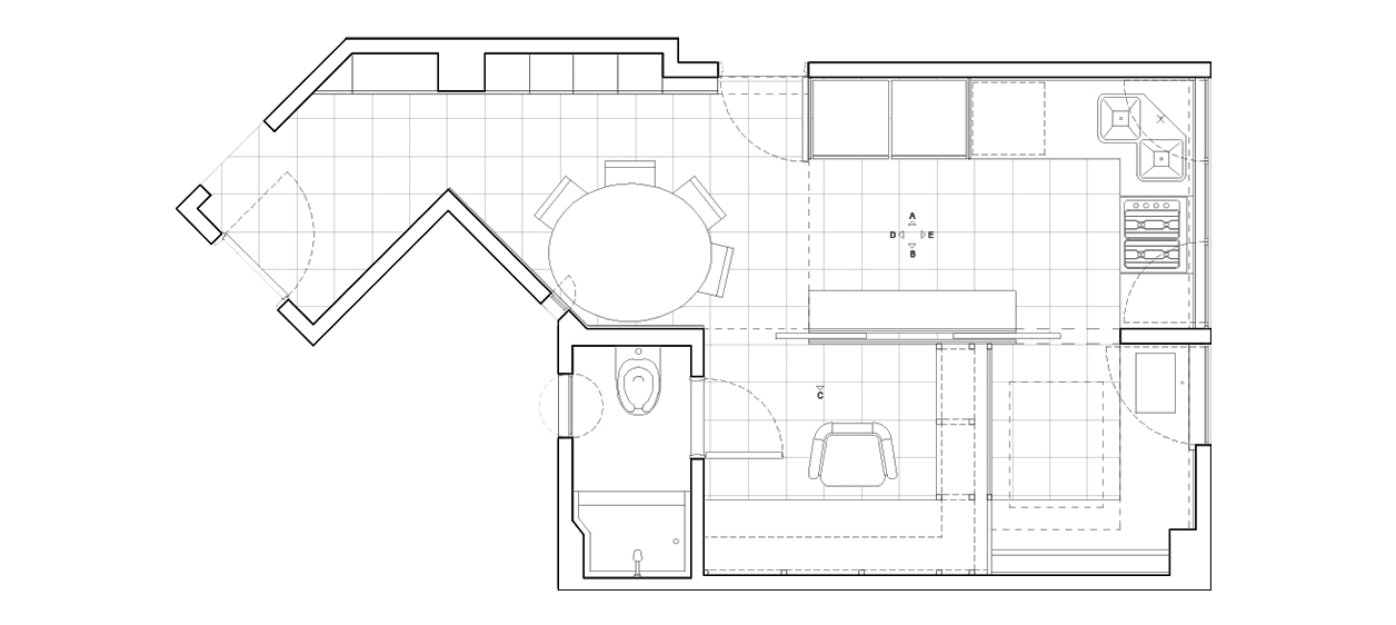 En la zona de la cocina y dormitorio de servicio, un mueble con límites móviles, distintos espesores y opacidades, optimizó las superficies y permitió crear nuevos espacios de cocina, lavado y planchado, trabajo y estudio.