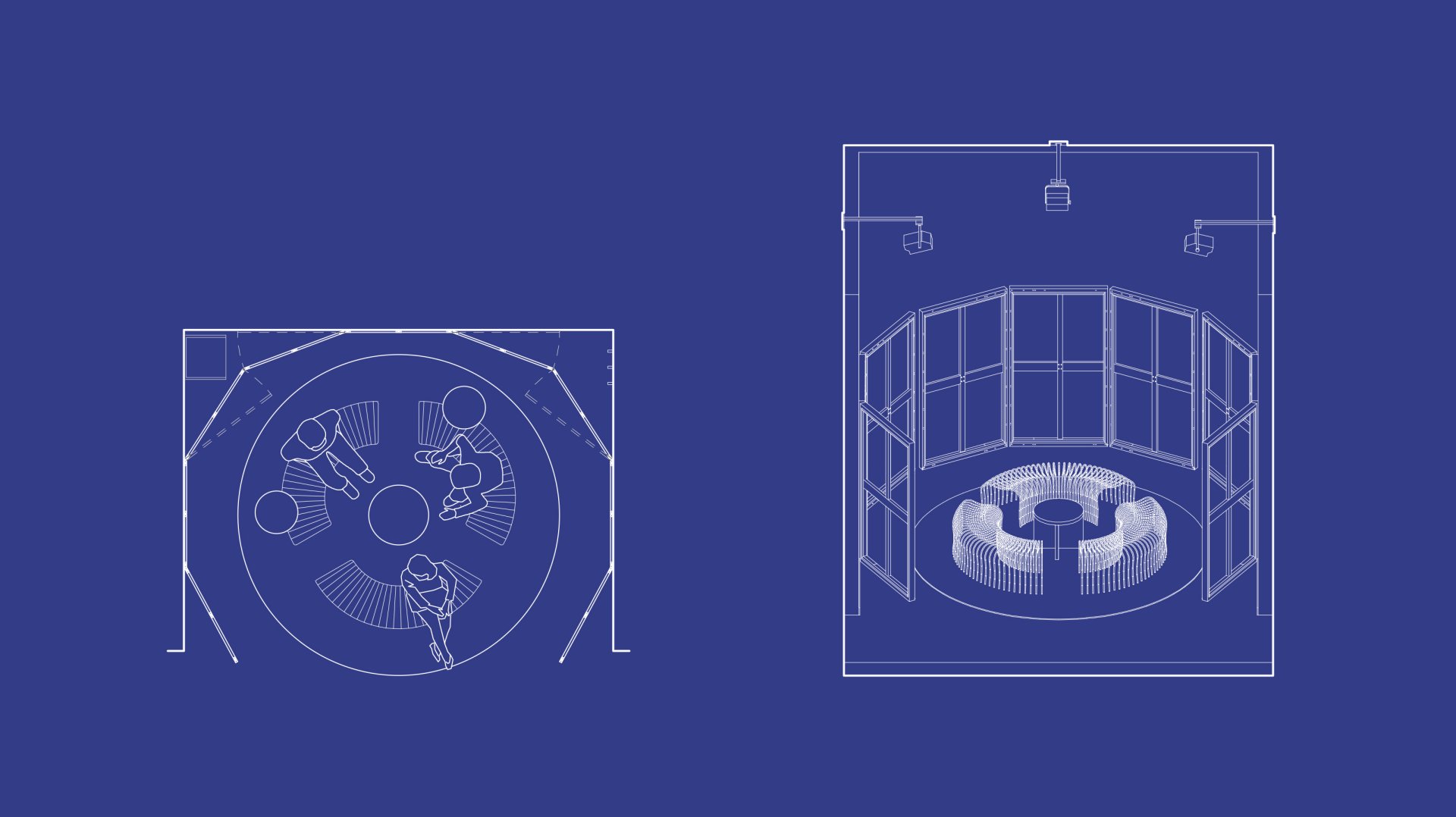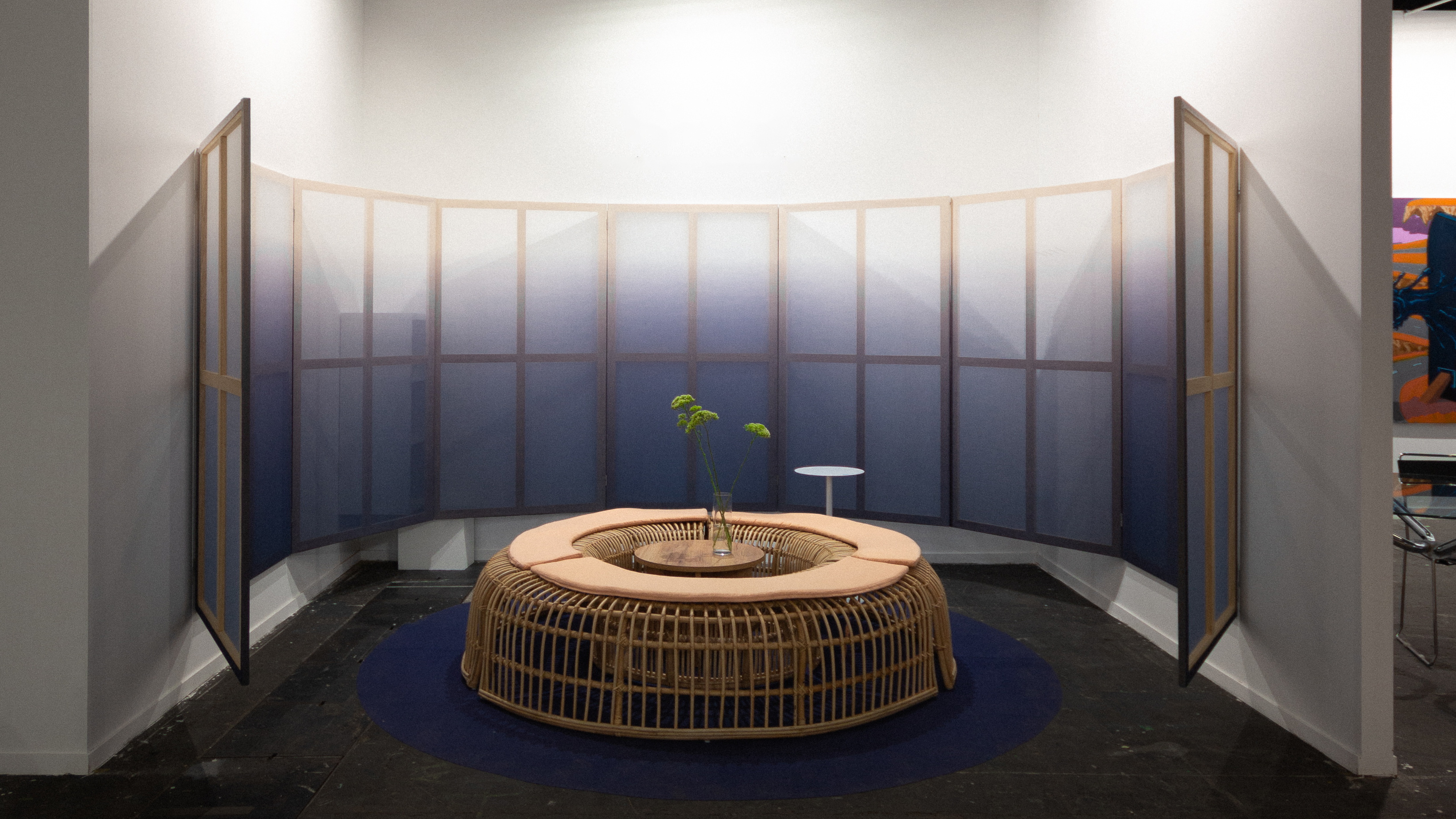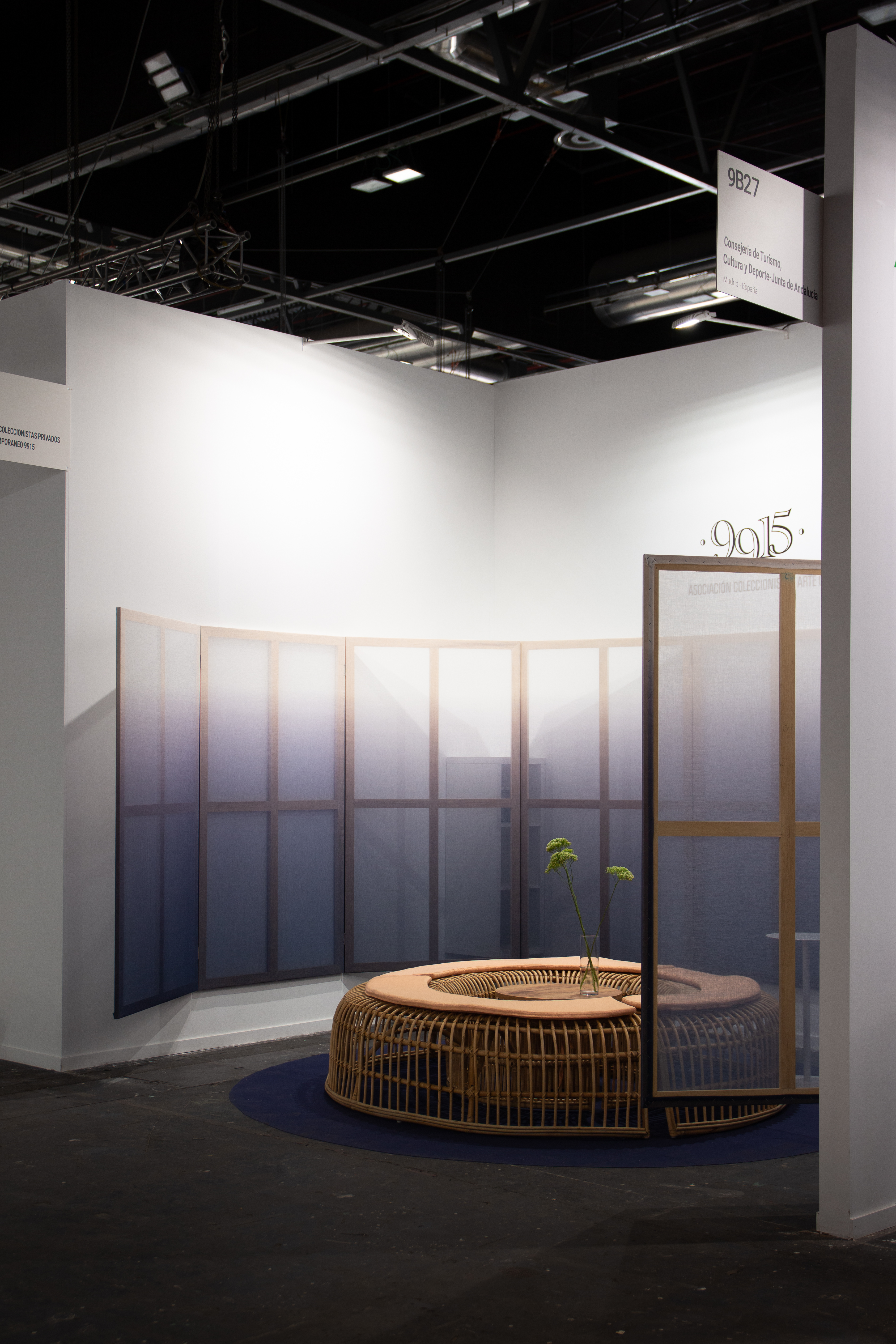 Ante los 3 muros, 3 trípticos. La intervención en madera y textil, hace propio al espacio anónimo con una nueva piel azul que se funde e integra gradualmente con la feria. Además, hace referencia al refugio del Tilonorinco, el pájaro coleccionista que tiene predilección por ese color y representa a 9915 en su logo. El conjunto se completa con piezas de mobiliario de carácter escultórico hechas artesanalmente en fibras naturales.