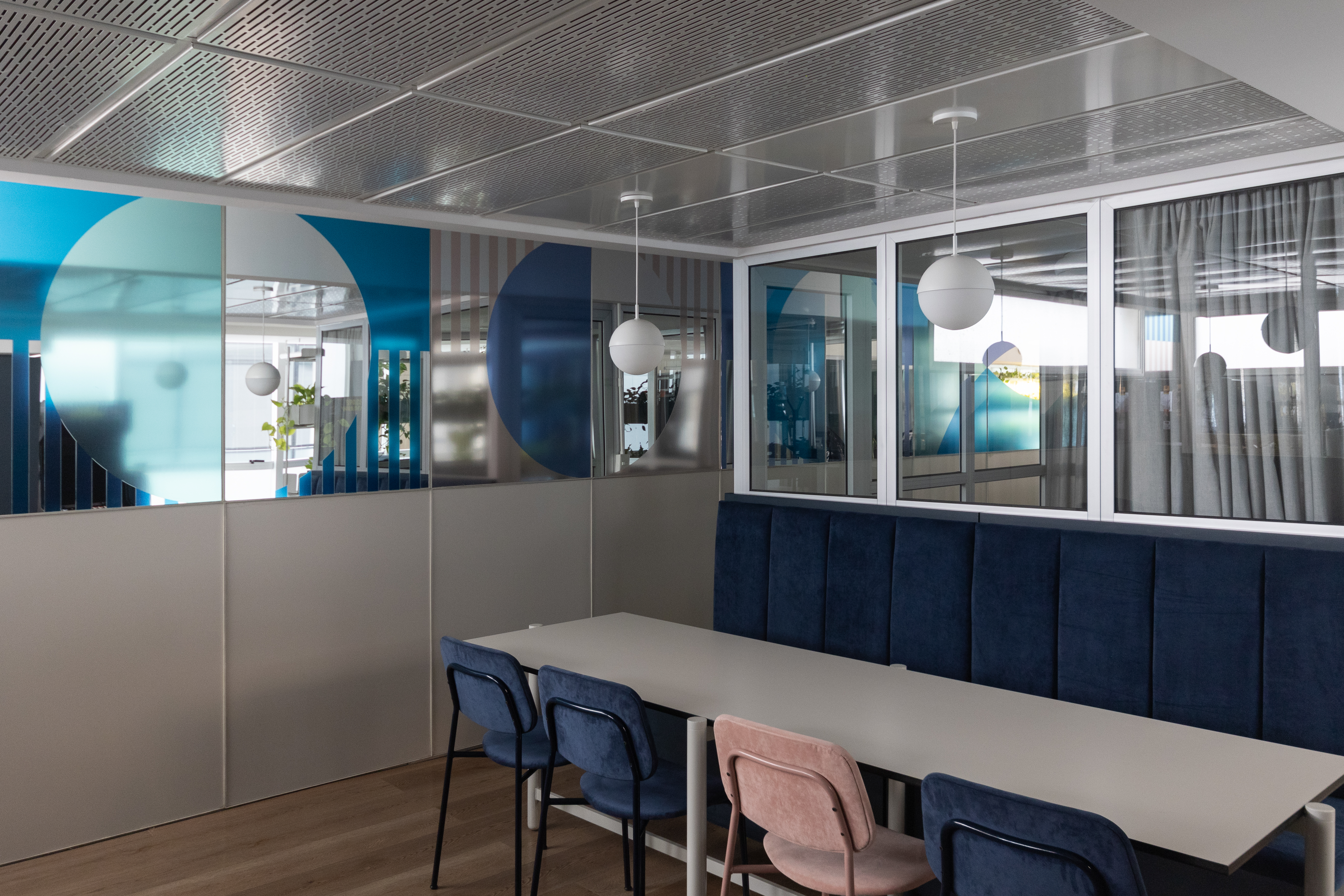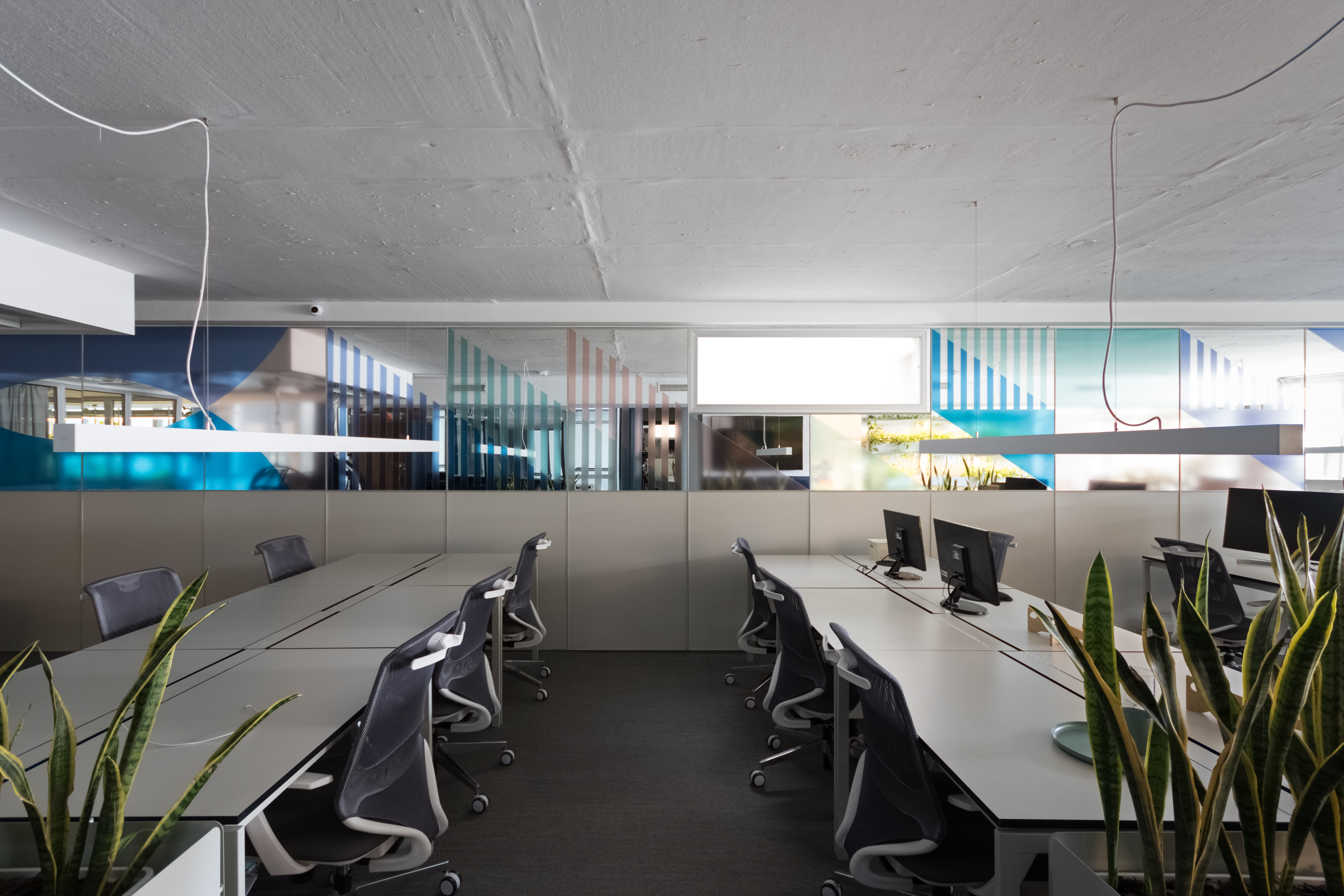 La intervención gráfica en el muro medianero, desarrollada en conjunto con el artista y diseñador Paul Sende, tiene como premisa replicar la luz y ampliar la percepción del espacio de forma controlada, aportando ritmo, color, cociendo e integrando de punta a punta una oficina predominantemente longitudinal.
