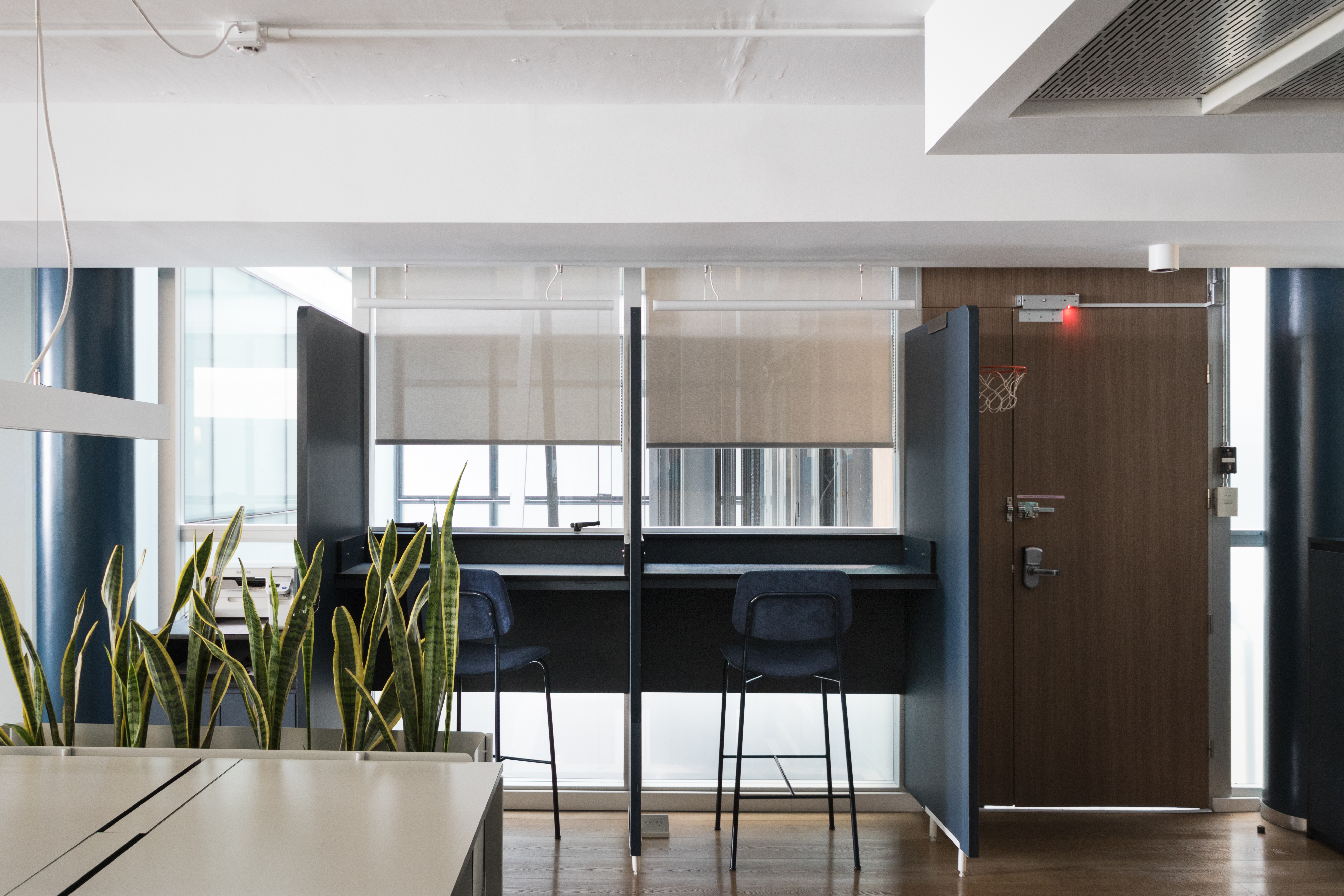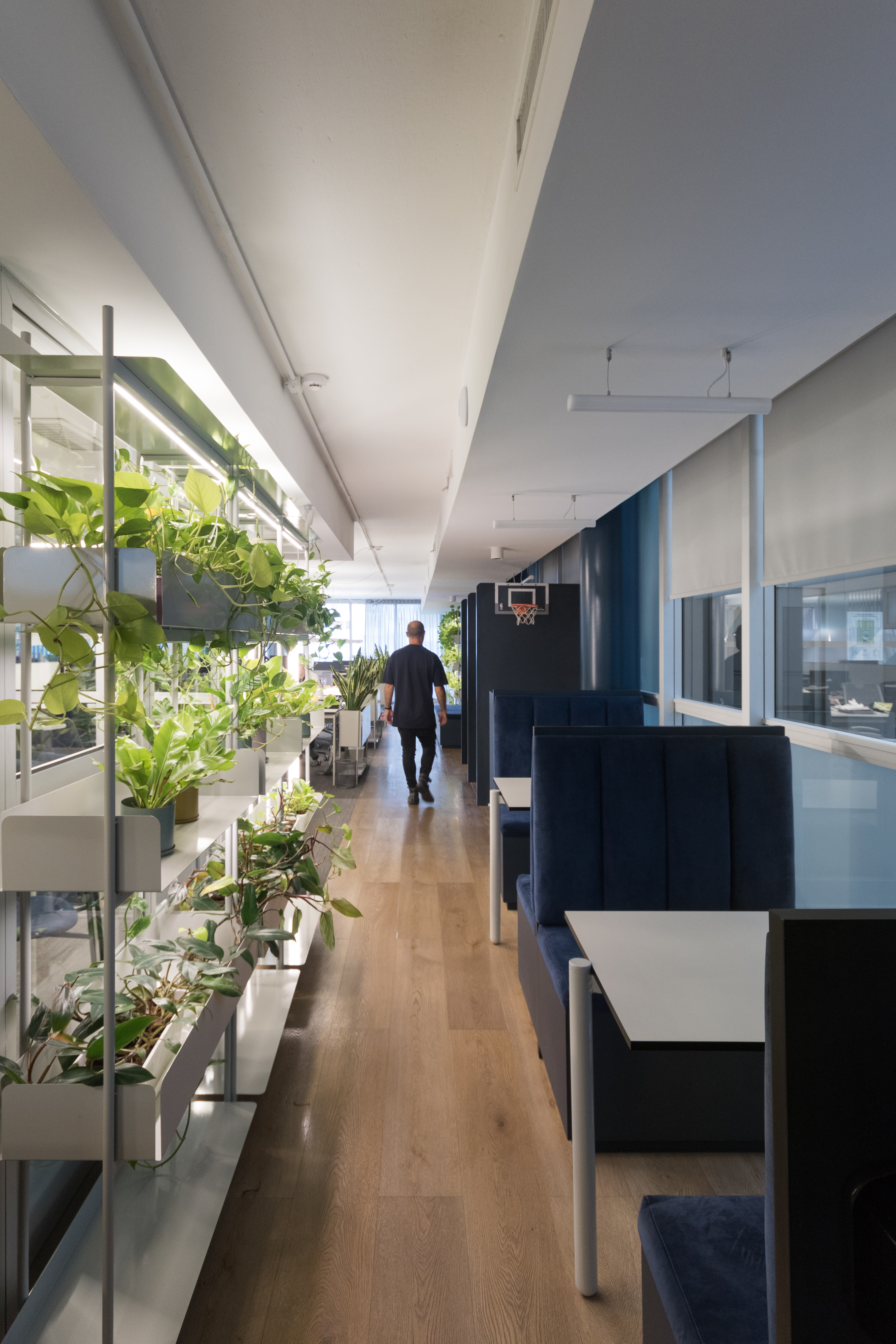 Buscamos plasmar su cultura 'tech', estimulante, dinámica y distendida, proponiendo una variedad de situaciones tanto de trabajo como de descanso. Para ello diseñamos cada estantería, mesa, sofá y mueble de guardado. A su vez, calibramos las dimensiones de cada área para maximizar la planta sin sacrificar calidad espacial y trabajamos los límites entre ellas con distintos tipos de filtros según la privacidad requerida.
